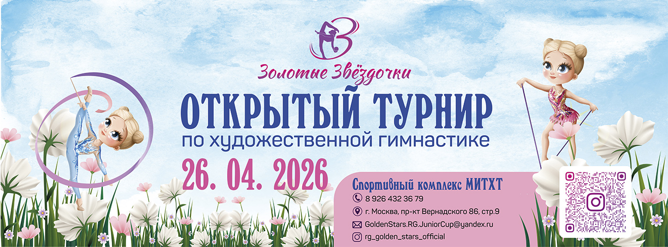 Летние учебно-тренировочные сборы по художественной гимнастике под руководством Мизенко Веры Сергеевны, 13-19 июля 2026, Суздаль 934 Турнир по художественной гимнастике «Блеск композиции», 3 мая 2026, Москва 354 Турнир по художественной гимнастике «Шаги к успеху», 25 апреля 2026, Казань 148 Турнир по художественной гимнастике «Шаги к успеху», 19 апреля 2026, Москва 90 Открытый турнир по художественной гимнастике «РУССКИЕ ЗВЁЗДОЧКИ», 19 апреля 2026, Москва 553 Турнир по художественной гимнастике РОО ЦХГ «Крылья» «Крылья СUP», 12 апреля 2026, Москва 249 Открытый турнир по художественной гимнастике (Открытая клубная лига) «В гостях у сказки», 11 апреля 2026, Красногорск 655 Открытый турнир по художественной гимнастике «BAGIRA» на призы Екатерины Фетисовой, 5 апреля 2026, Красногорск 447 Открытая Клубная Лига «Diva Cup», 4-5 апреля 2026, Казань 815 Интенсив-сбор с разбором программ, 29.03-05.04.2026, МО, Яхрома, Волен 243 Соревнования по художественной гимнастике «Мисс Весна», 29 марта 2026, Москва 669 Открытая Клубная Лига. Турнир по художественной гимнастике «Шаги к успеху», 28 марта 2026, Самара 374 Соревнования по художественной гимнастике «Полёт ласточки», 18-19 апреля 2026, Екатеринбург 13 Открытый турнир по художественной гимнастике «МАЙСКИЙ КУБОК», 16 мая 2026, Москва 16 Региональные соревнования и турнир по художественной гимнастике «Смоленские самоцветы», 1-3 мая 2026, Смоленск 44