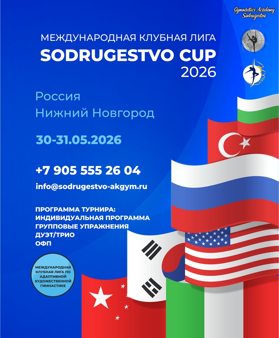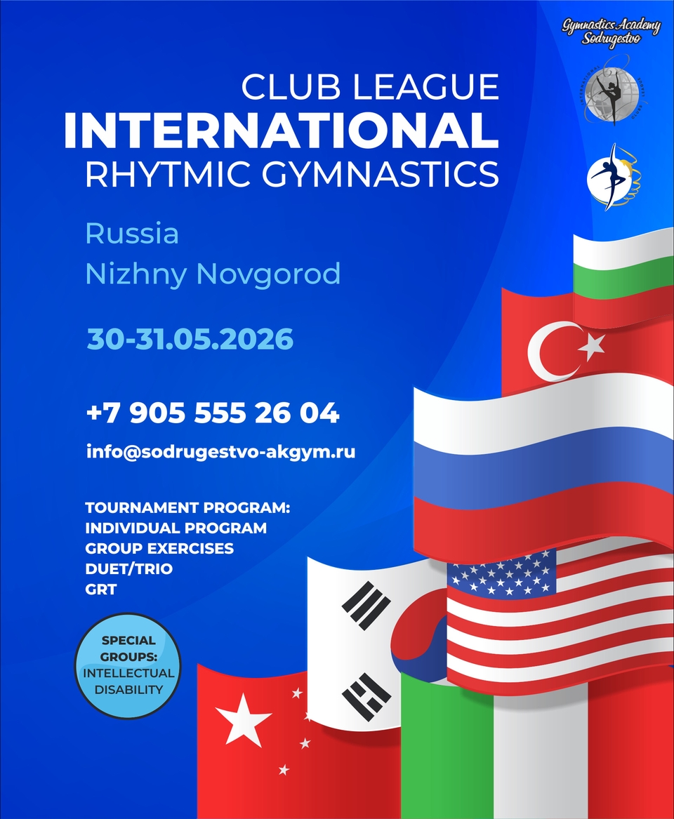 Турнир по художественной гимнастике «Блеск композиции», 3 мая 2026, Москва 311 Турнир по художественной гимнастике «Шаги к успеху», 25 апреля 2026, Казань 91 Турнир по художественной гимнастике «Шаги к успеху», 19 апреля 2026, Москва 47 Открытый турнир по художественной гимнастике «РУССКИЕ ЗВЁЗДОЧКИ», 19 апреля 2026, Москва 506 Турнир по художественной гимнастике РОО ЦХГ «Крылья» «Крылья СUP», 12 апреля 2026, Москва 204 Открытый турнир по художественной гимнастике (Открытая клубная лига) «В гостях у сказки», 11 апреля 2026, Красногорск 510 Открытый турнир по художественной гимнастике «BAGIRA» на призы Екатерины Фетисовой, 5 апреля 2026, Красногорск 286 Открытая Клубная Лига «Diva Cup», 4-5 апреля 2026, Казань 760 Интенсив-сбор с разбором программ, 29.03-05.04.2026, МО, Яхрома, Волен 227 Соревнования по художественной гимнастике «Мисс Весна», 29 марта 2026, Москва 625 Открытая Клубная Лига. Турнир по художественной гимнастике «Шаги к успеху», 28 марта 2026, Самара 337 Фестиваль по художественной гимнастике в рамках чемпионата г.Таганрога «Южаночка», 24-26 апреля 2026, Таганрог 9 Открытый турнир по художественной гимнастике «Акварель весны», 12 апреля 2026, Казань 14 V ЮБИЛЕЙНЫЙ Турнир по художественной гимнастике «КУБОК ТАЛАНТОВ», 12 апреля 2026, Казань 37 Международная Клубная Лига по художественной гимнастике «SODRUGESTVO CUP», 30-31 мая 2026, Нижний Новгород, Заволжье 48