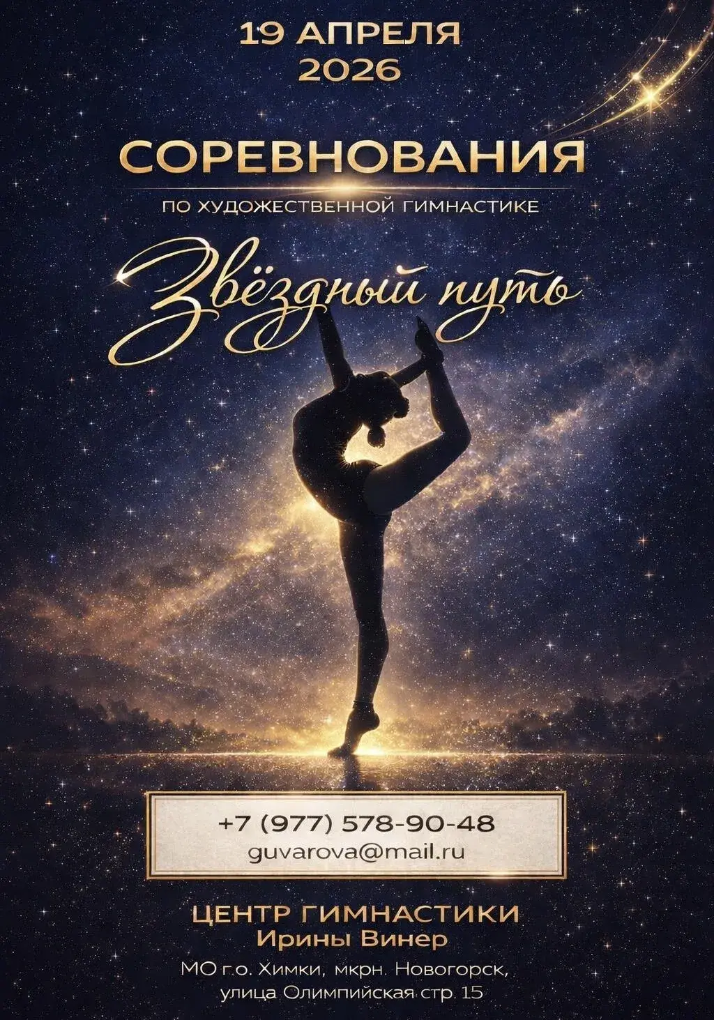 Открытый турнир по художественной гимнастике «РУССКИЕ ЗВЁЗДОЧКИ», 19 апреля 2026, Москва 454 Турнир по художественной гимнастике РОО ЦХГ «Крылья» «Крылья СUP», 12 апреля 2026, Москва 153 Открытый турнир по художественной гимнастике (Открытая клубная лига) «В гостях у сказки», 11 апреля 2026, Красногорск 244 Открытый турнир по художественной гимнастике «BAGIRA» на призы Екатерины Фетисовой, 5 апреля 2026, Красногорск 137 Открытая Клубная Лига «Diva Cup», 4-5 апреля 2026, Казань 686 Интенсив-сбор с разбором программ, 29.03-05.04.2026, МО, Яхрома, Волен 207 Соревнования по художественной гимнастике «Мисс Весна», 29 марта 2026, Москва 567 Открытая Клубная Лига. Турнир по художественной гимнастике «Шаги к успеху», 28 марта 2026, Самара 297 Открытая клубная лига «Вальс цветов», 22 марта 2026, Москва 627 Открытая Клубная Лига. Турнир по художественной гимнастике «Шаги к успеху», 21 марта 2026, Казань 595 Турнир по художественной гимнастике «Вдохновленные победой» на призы Чемпионки Мира ЗМС Полины Орловой, 02-03 мая 2026, Владикавказ 33 I Открытый турнир по художественной гимнастике «ЯРКОЕ ДЕТСТВО-2026», 23-24 мая 2026, Санкт-Петербург 21 Открытый клубный турнир по художественной гимнастике «Поколение А», 25 апреля 2026, Красногорск 51 23rd Rhythmic Gymnasticss Open Championship «PRINCESS CUP», 18-21.06.2026, Baku, Azerbaijan 50 Соревнования по художественной гимнастике «Детские мечты» (выполнение до 2 спортивного включительно), 30-31 мая 2026, Москва 115